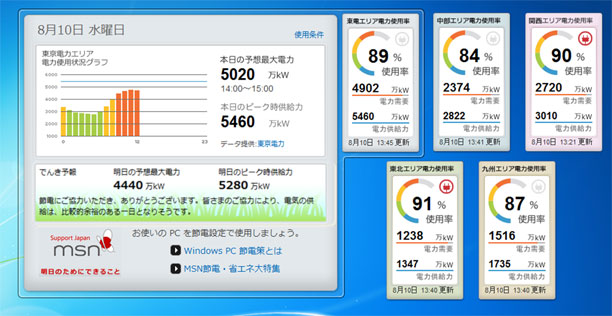 電力需給情報ガジェット [5 電力会社対応版]更新日: 2011 年 8 月 11 日 2011 年 7 月 14 日に公開した東京電力でんき予報対応版 (version 2) に引き続き、2011 年 8 月 11 日に関西電力、東北電力、中部電力、九州電力に対応した version 3 を公開しました。お住まいのエリアの需給情報がジェットをインストールいただき、引き続き節電の意識啓発にご利用ください。 なお、2011 年 6 月 30 日以前にダウンロードいただいた東京電力版ガジェットについてはアンインストールの上、東京電力でんき予報対応版をご利用ください。