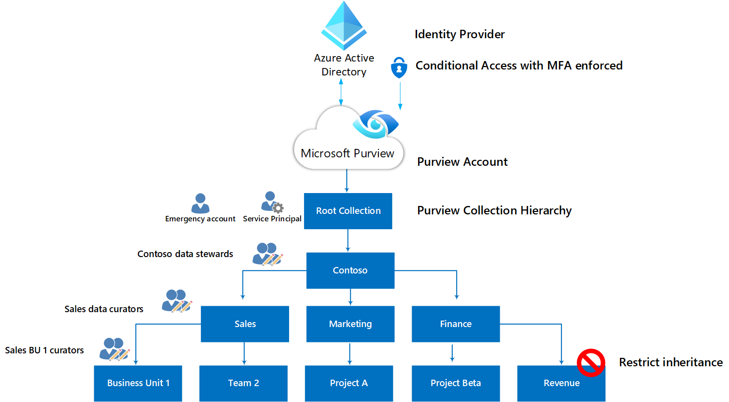 Microsoft Purview コレクション階層に基づいて、Microsoft Purview で最小特権アクセス モデルを割り当てる方法の詳細については、「 Microsoft Purview でのアクセス制御」を参照してください。