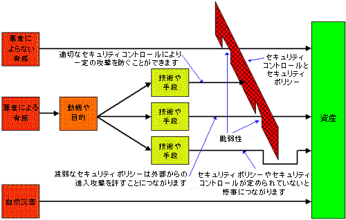 攻撃者は、目的を達成するためにセキュリティ ポリシーやシステムの脆弱性をせめる既知のテクニックを用います。コンピュータ セキュリティに関連する一般的な脅威、攻撃者の抱く動機と目的、用いるテクニックと手段、システムやセキュリティ ポリシーの脆弱性などについては、次のセクションで説明します。
