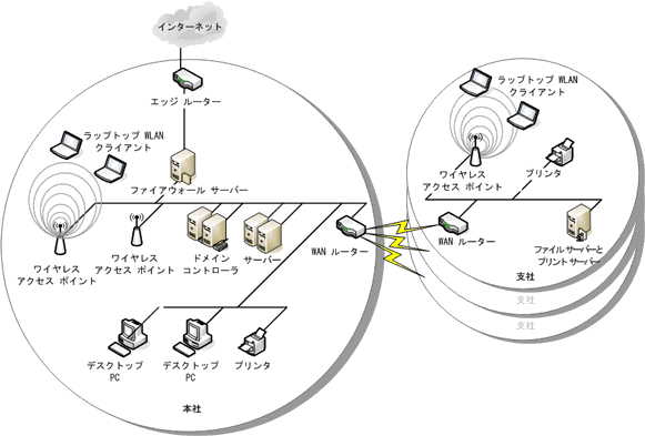 拡大表示する IT システムおよびユーザーの大半を収容する大規模な本社が 1 つ存在します。ここには、Active Directory ドメイン コントローラがすべて配置されます。本社では、ファイアウォール サーバー経由でインターネットに接続できます。内部ネットワークに接続された WLAN クライアントおよびワイヤレス AP も、いくつか存在します。