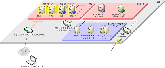 RADIUS コンポーネントを利用できるその他のネットワーク アクセス サービスとして、VPN とリモート ダイヤルアップがあります。特に大規模な組織では、RADIUS プロキシの追加など、現状の設計になんらかの追加を行わなければならない場合があります。次の図に、拡張されたソリューションを示します。