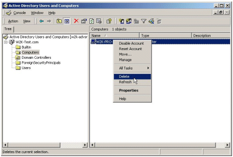 削除するコンピュータを右クリックし、メニューの [削除] を選択して、ドメインからコンピュータを削除します。