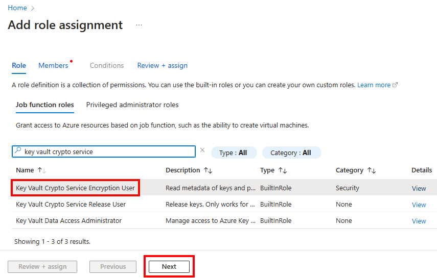 EKM アプリケーションでは、ラップ操作とラップ解除操作を実行するために、キー コンテナー暗号化サービスの暗号化ユーザーロールが必要です。 [キー コンテナー暗号化サービスの暗号化ユーザー] を検索してロールを選択します。 [次へ] を選択します。