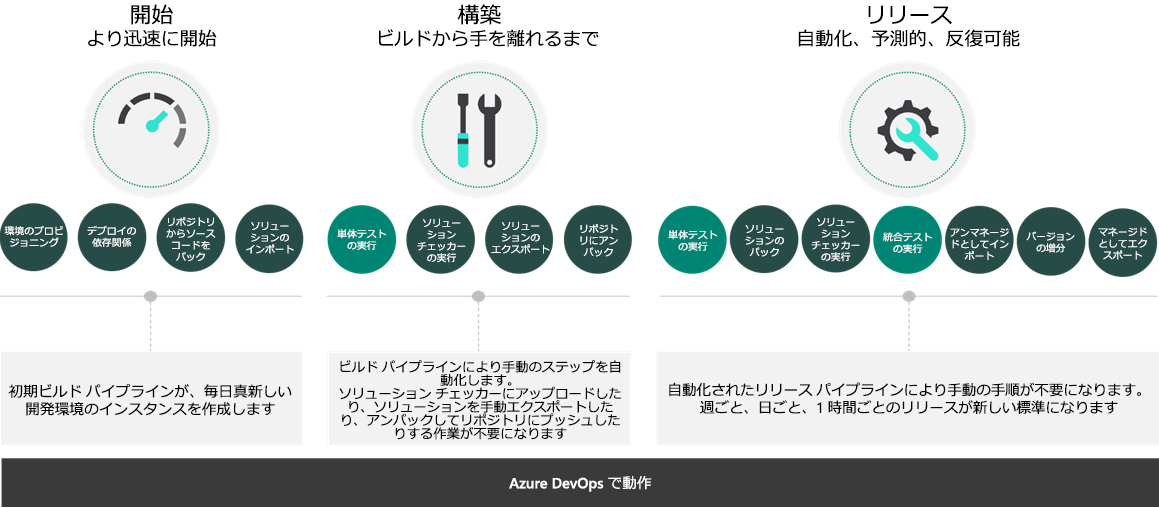 このセクションでは、Azure DevOps の概要と、展開を自動化するために Microsoft Power Platform で DevOps を使用する方法について説明します。