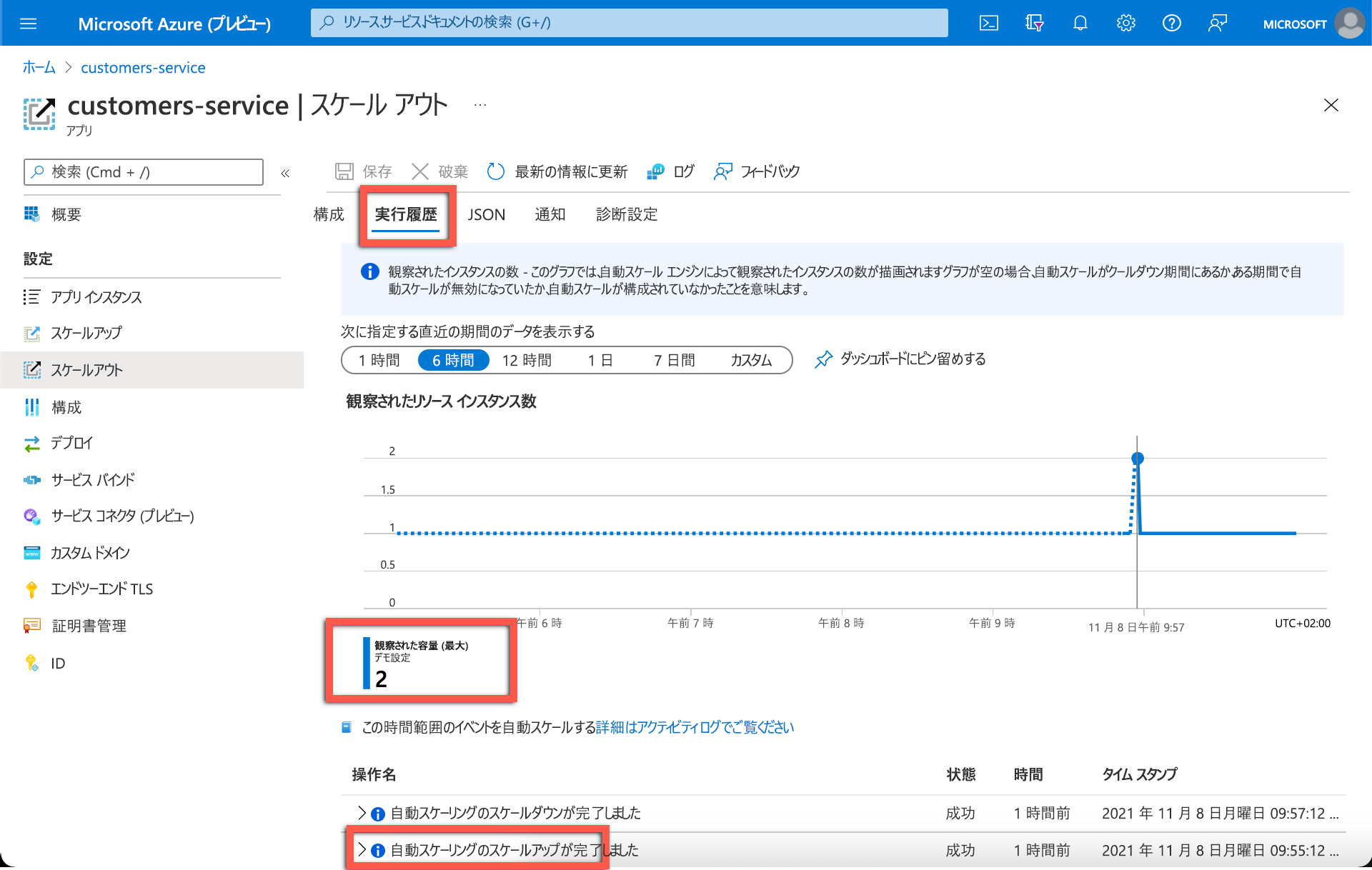 サンプルの Azure Spring Apps アプリケーションでは、アプリケーションを作成したときに、顧客サービス マイクロサービスでスケールアウト アクションがトリガーされています。