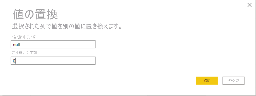 検索する値 ボックスに置換する値の名前を入力し、置換後 ボックスに正しい値の名前を入力して、OK を選択します。 Power Query では、Excel のように 1 つのセルを選択して 1 つの値を変更することはできません。