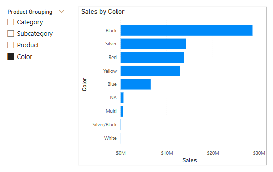 Product Grouping という名前のフィールド パラメーターが、テーブルの 4 つの列 (Product、Category、Subcategory、Product、Color) で構成されている例を考えてみましょう。 パラメーターがレポート ページに追加されると、レポート利用者はいずれかのフィールドを選択できます。 対応する棒グラフでは、選択したフィールドが Y 軸に配置されます。