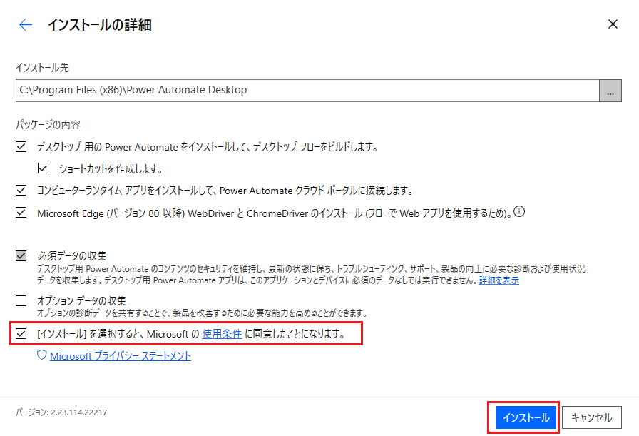 最後のチェック ボックスをオンにして Microsoft の使用条件に合意する必要があります。その後、インストール ボタン を選択します。 このアクションにより、Power Automate パッケージと、Microsoft Edge および Google Chrome 用ブラウザー拡張機能がインストールされます。