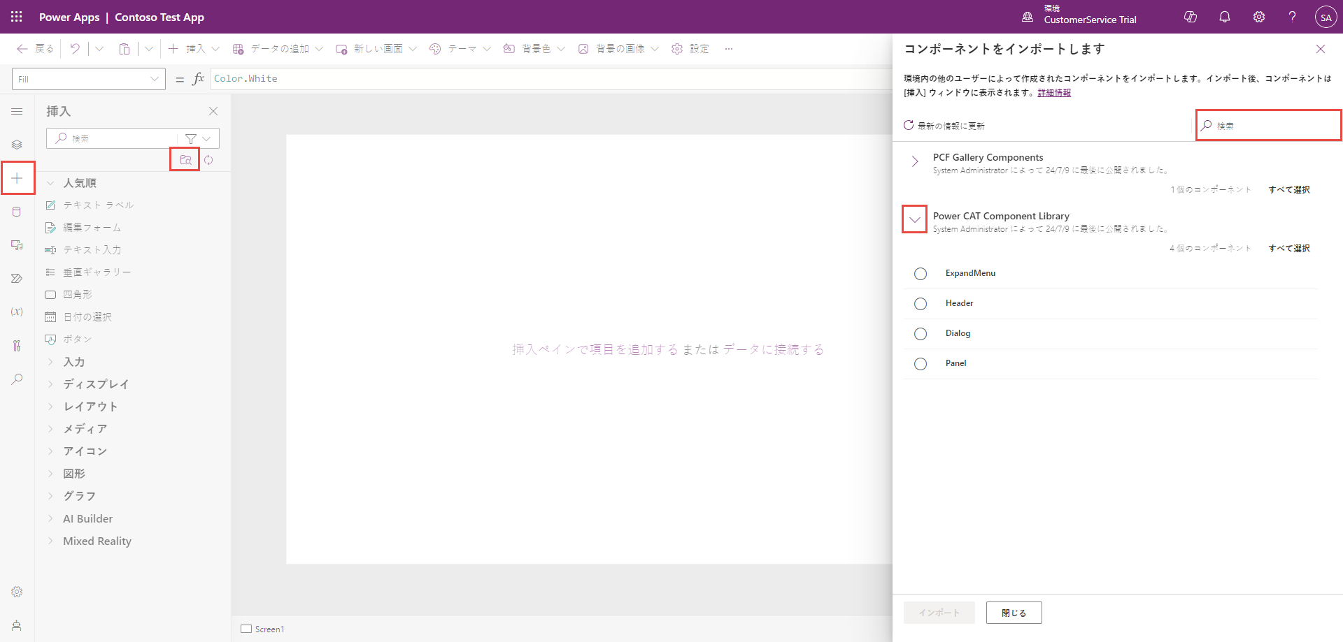 ライブラリ コンポーネントをアプリにインポートすると、そのコンポーネントを 挿入 メニューの ライブラリ コンポーネント から変更/挿入できるようになります。