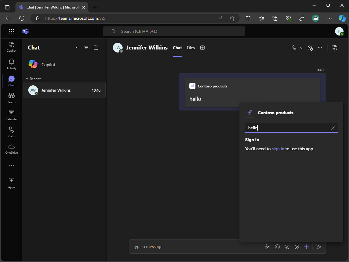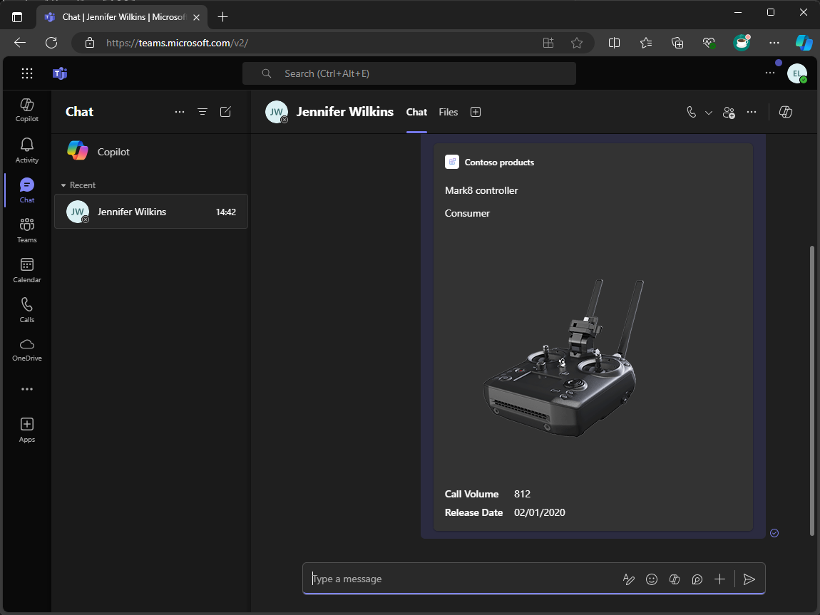 このモジュールを終了すると、TypeScript (Node.js で実行) で記述されたメッセージ拡張機能を作成できます。 Microsoft Teams、Microsoft Outlook、Microsoft 365 Copilotで使用できます。 保護された API の背後にあるデータに対してクエリを実行し、結果をリッチフォーマットされたカードとして返すことができます。