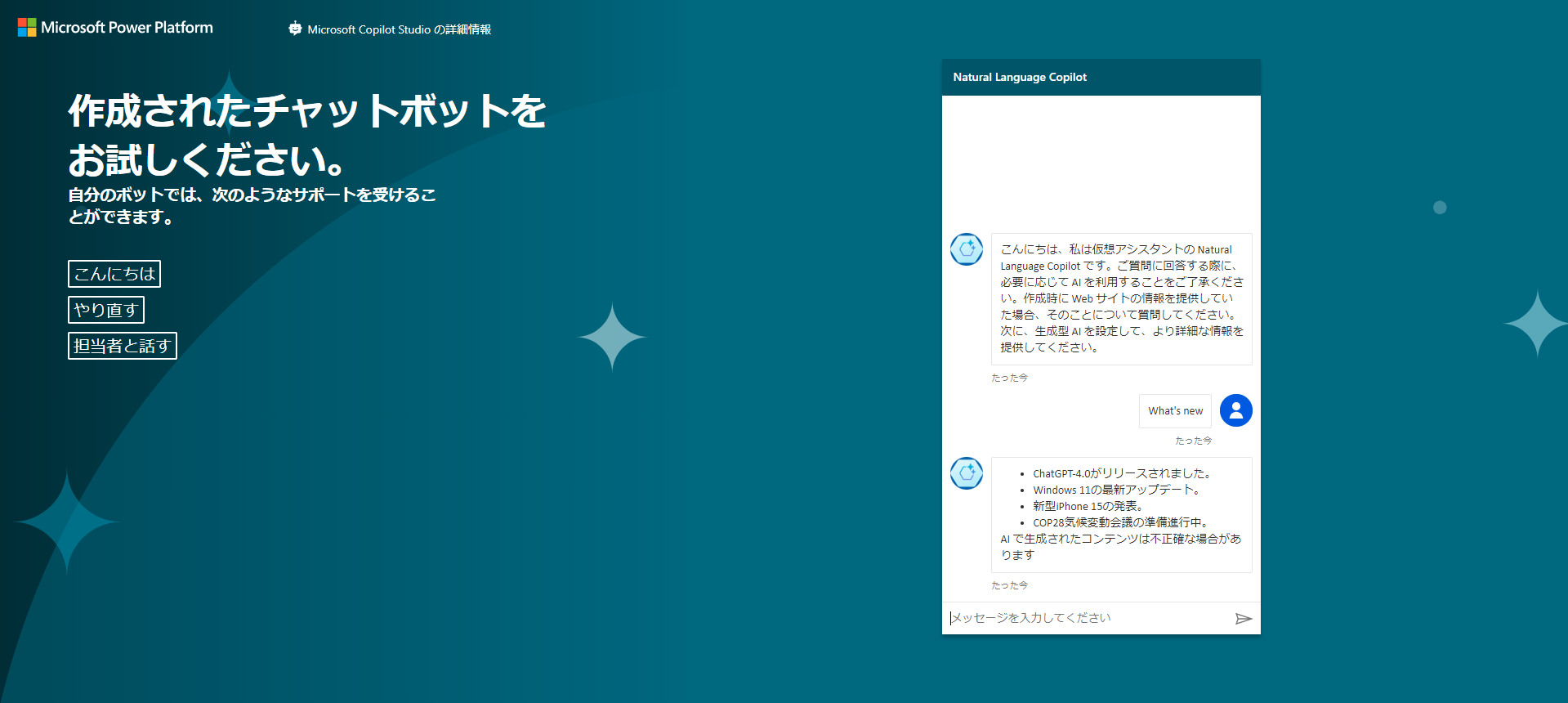 デモ Web サイトでは、公開済みのエージェントが使用されます。