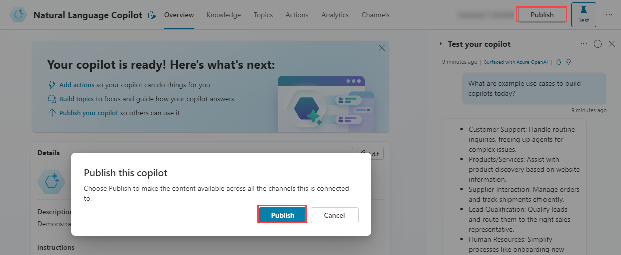 エージェントを更新するたびに、Copilot Studio でエージェントを再度公開することで、 エージェントを挿入または接続しているすべてのチャネルで、エージェントを更新できます。
