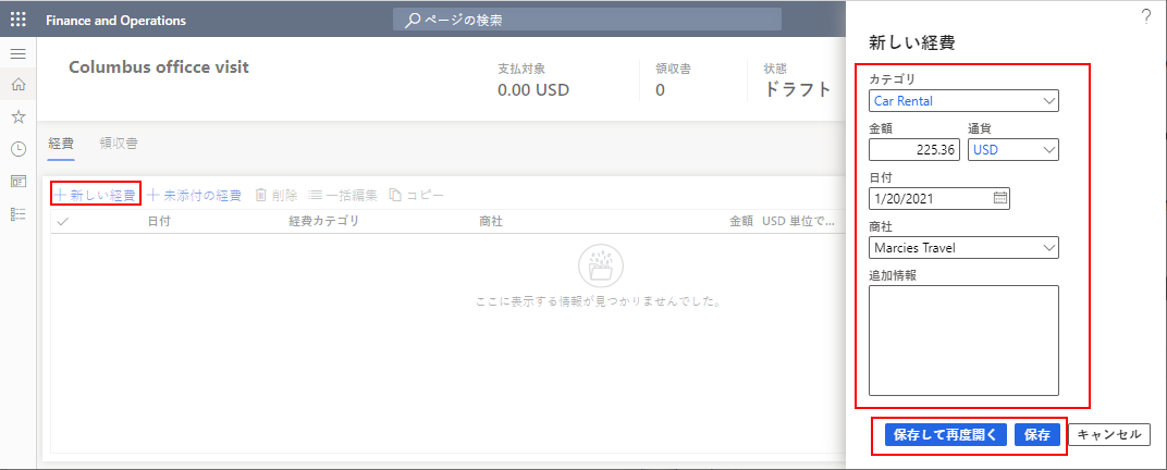 - 保存して新規 を選択して新しい経費を入力するか、保存 を選択してレポートに戻します。
