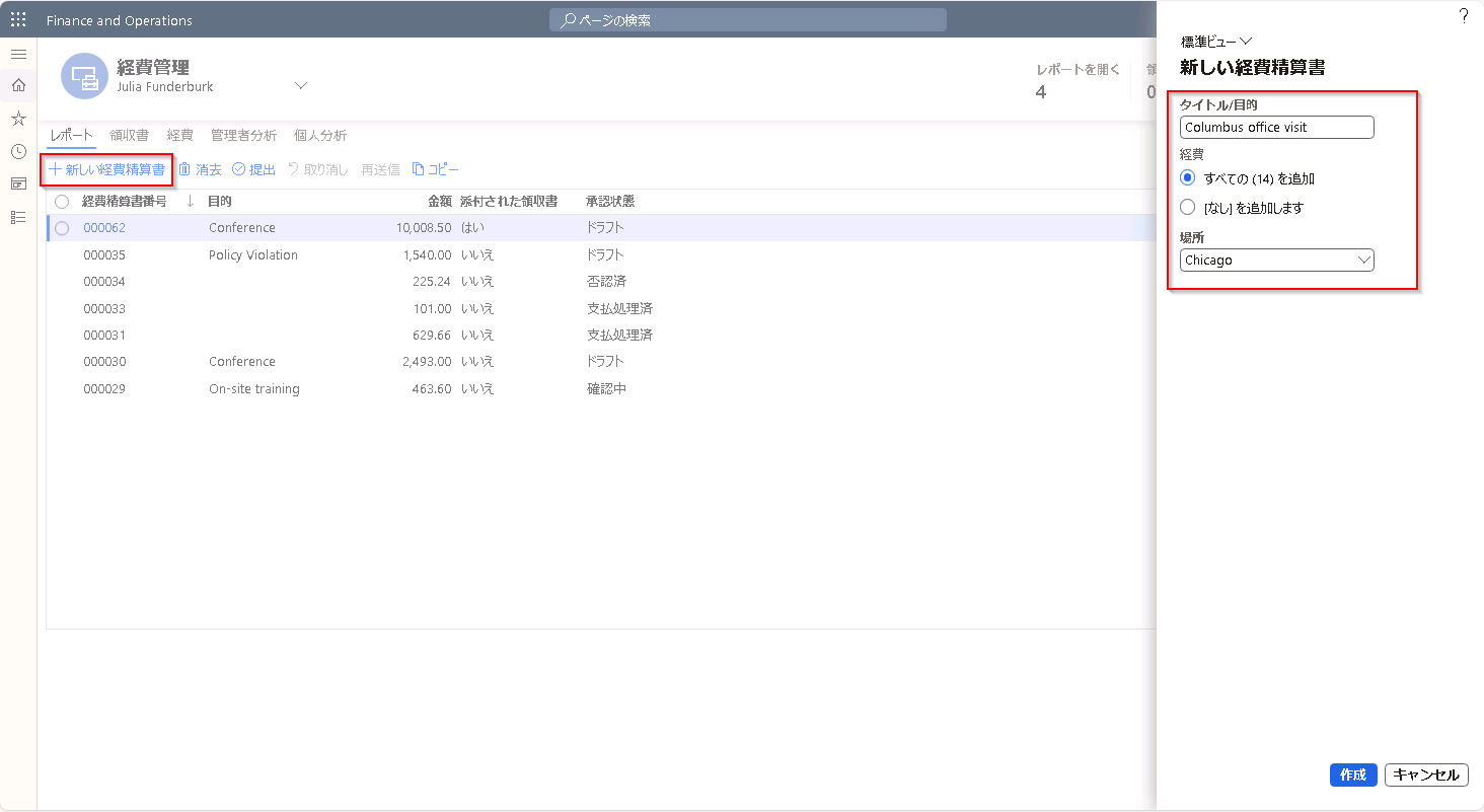 ![[新しい経費精算書] ダイアログ ボックスのスクリーンショット。](media/new-expense-report.png)