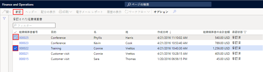 経費精算書が承認され、一般仕訳帳に転送されたら、一般会計に転記できます。