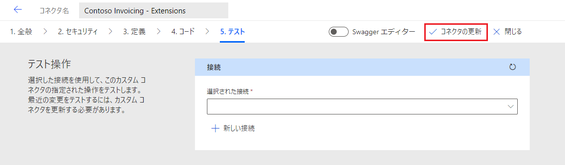 { "invoiceId": "1934", "date": "2023-03-19T06:55:45.9039452+00:00", "createDate": "2023-03-14T06:55:45.9039456Z", "amount": 8000, "accountId": "1001", "accountName": "Wing Tips", "status": "Invoiced", "typeId": 1, "purchaseOrderId": "3004", "tags": "New Account;Special Pricing;Non-returnable" }テスト タブを選択し、コネクタの更新を選択した後、更新が完了するまで待ちます。