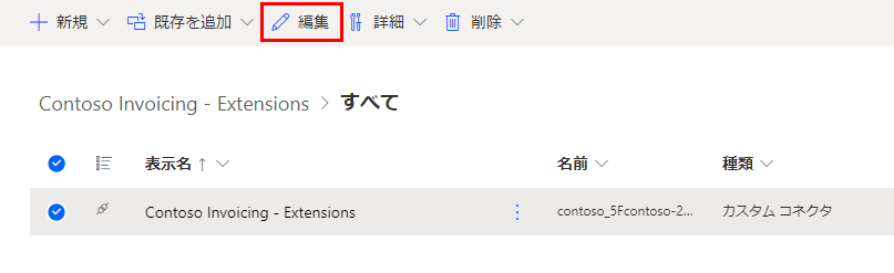 Contoso Invoicing - Extensions コネクタを選択して、編集を選択します。 別の演習で作成した場合、コネクタ名に Extensions が含まれていないことがありますが、問題ありません。