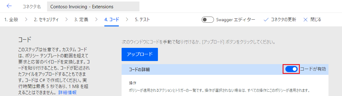 ListInvoice 操作は追加されているが、LastInvoice 操作は追加されていない Contoso Invoicing カスタム コネクタを変更します。 そのため、LastInvoice 操作を追加して、作成された最新の請求書を取得します。 Contoso Invoicing のネットワーク API ではこの操作はサポートされないため、LastInvoice 操作で実行されているカスタム コードを使用して、要求を API の ListInvoice にリダイレクトした後、作成された最新の請求書のみを返すよう応答を変換します。