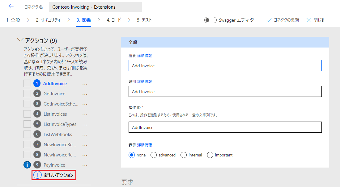 このタスクでは、Contoso Invoicing カスタム コネクタで新しい操作を作成します。