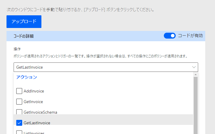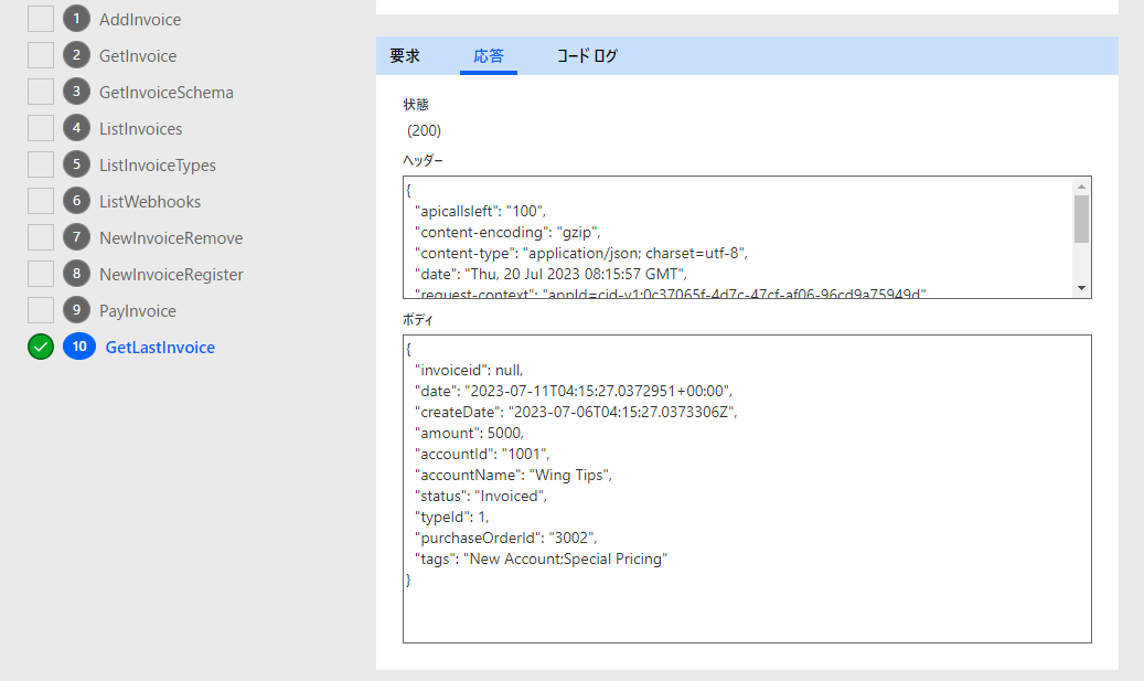 操作ドロップダウン メニューを選択し、GetLastInvoice 操作を選択します。