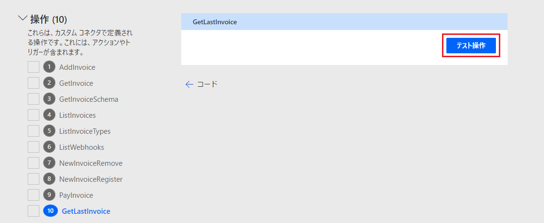 操作セクションまで下にスクロールし、GetLastInvoice を選択して操作のテストを選択します。