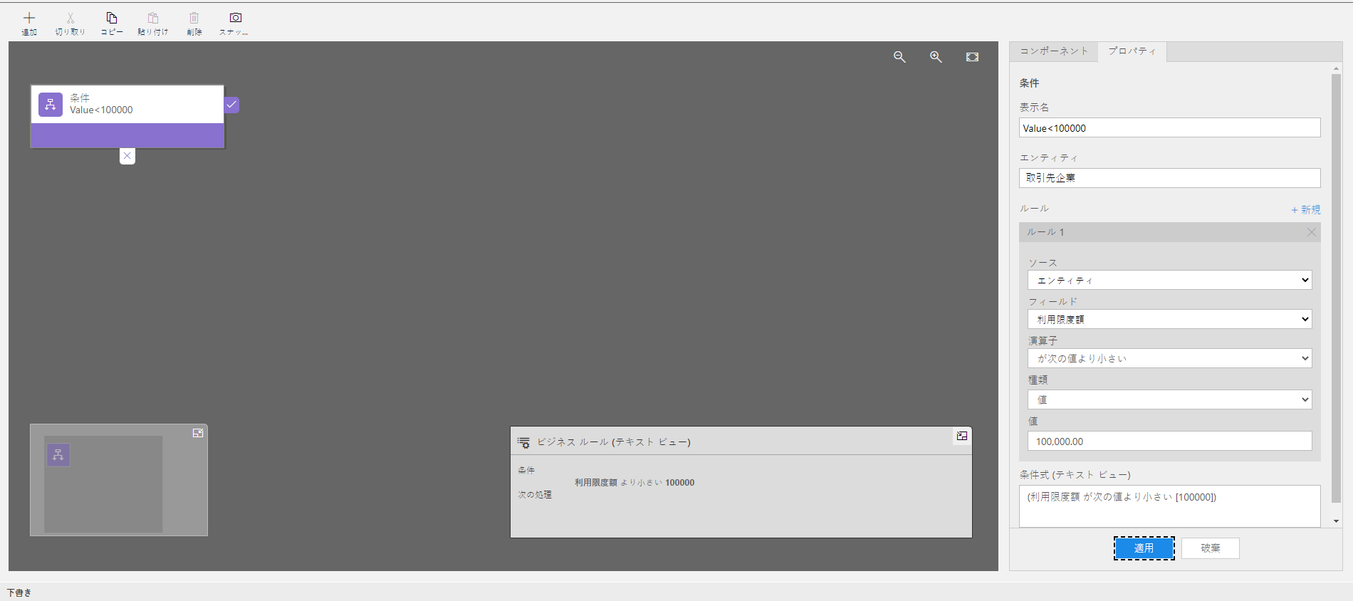 条件のプロパティを設定するには、デザイナー ウィンドウで条件コンポーネントを選択し、画面右側のプロパティ タブでプロパティを設定します。 プロパティを設定すると、Microsoft Dataverse でプロパティ タブの下部に式が作成されます。この例として、ここでは条件を "与信限度額が [100000] 未満である" に設定します。