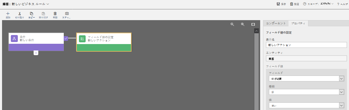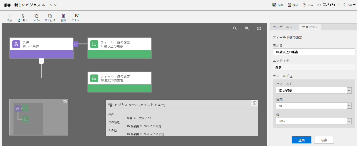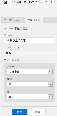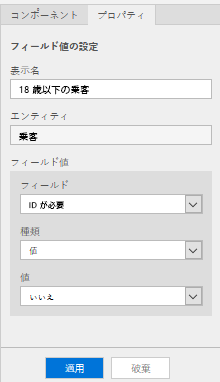 ]](../media/unit-3-8.png#lightbox)フィールド値の設定コンポーネントで、表示名 フィールドに 18 歳を超えている乗客と入力して、乗客の年齢が 1 歳を超えていることを示します。 エンティティ フィールドに、乗客を入力します。 フィールド ドロップダウン メニューで必須 ID を選択し、値ドロップダウン メニューではいを選択してから、適用を選択します。