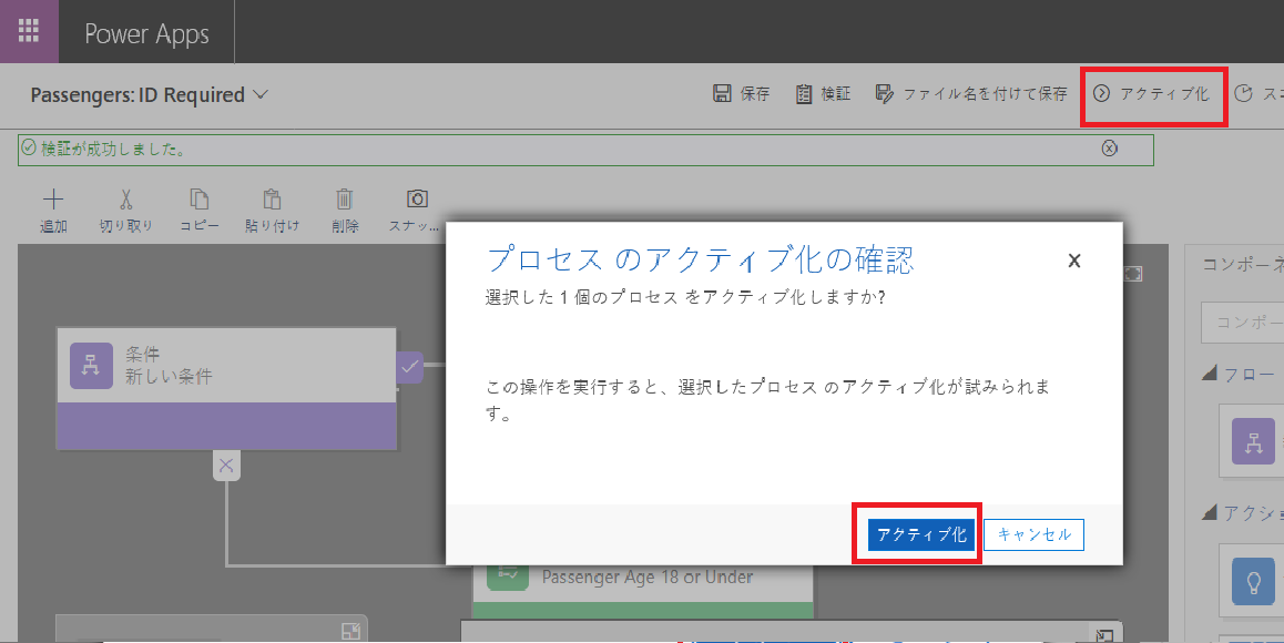 右上隅のメニュー バーにあるアクティブ化ボタンを選択します。 これにより、プロセスのアクティブ化の確認ダイアログ ボックスが表示されます。 ダイアログ ボックスの下部にあるアクティブ化ボタンを選択して、アクティブ化を確認します。