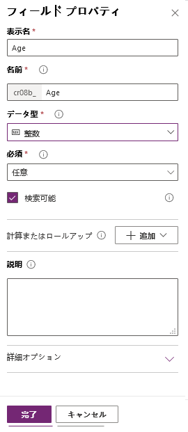 + 新しい列を選択し、表示名 フィールドに年齢と入力します。 データ型 ドロップダウン 一覧で 整数 を選択し、保存 を選択して新しい列を追加します。
