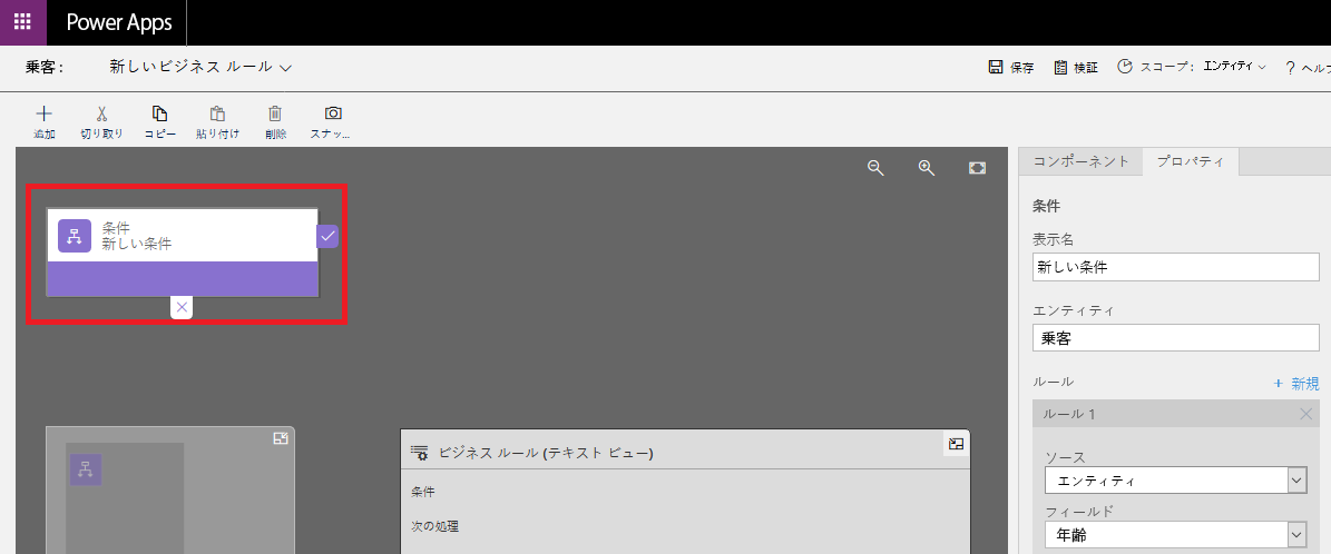 メイン デザイン領域で、条件を選択します。 この選択により、ビジネス ルールの条件を設定できるパネルが開きます。