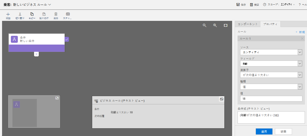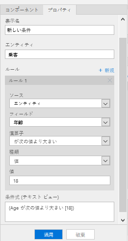 [条件] パネルのフィールド 値 エンティティ 乗客 ソース エンティティ フィールド 年齢 オペレーター が次の値より大きい タイプ 値 値 18 パネルの下部にある適用ボタンを選択します。