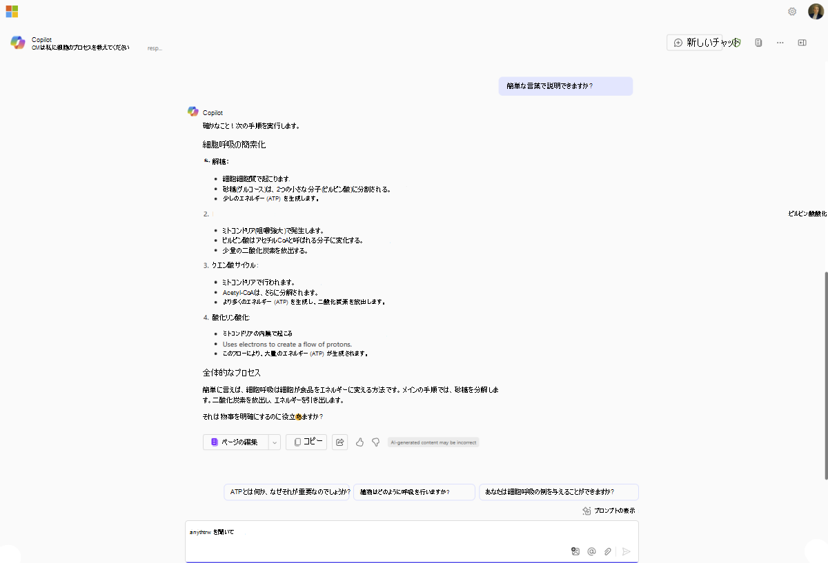 Copilot Chatエクスペリエンスでは、教師はフォローアップの質問をすることができます。 さまざまな詳細な回答を得るための例を次に示します。