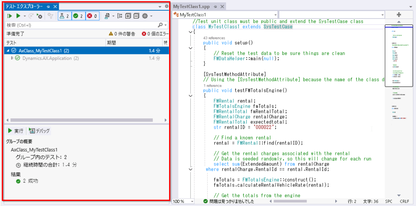 //Test unit class must be public and extend the SysTestCase class class MyTestClass1 extends SysTestCase { public void setup() { // Reset the test data to be sure things are clean FMDataHelper::main(null); } [SysTestMethodAttribute] // Using the [SysTestMethodAttribute] because the name of the class does not begin with “Test”. public void testFMTotalsEngine() { FMRental rental; FMTotalsEngine fmTotals; FMRentalTotal fmRentalTotal; FMRentalCharge rentalCharge; FMRentalTotal expectedtotal; str rentalID = '000022'; // Find a known rental rental = FMRental::find(rentalID); // Get the rental charges associated with the rental // Data is seeded randomly, so this will change for each run select sum(ExtendedAmount) from rentalCharge where rentalCharge.RentalId == rental.RentalId; fmTotals = FMTotalsEngine::construct(); fmTotals.calculateRentalVehicleRate(rental); // Get the totals from the engine fmRentalTotal = fmTotals.totals(rental); // Set the expected amount expectedTotal = rental.VehicleRateTotal + rentalCharge.ExtendedAmount; this.assertEquals(expectedTotal,fmRentalTotal); } [SysTestMethodAttribute] public void testFMCarValidateField() { FMCarClass fmCar; fmCar.NumberOfDoors = -1; this.assertFalse(fmCar.validateField(Fieldnum("FMCarClass", "NumberOfDoors"))); } }クラスを保存します。 テスト エクスプローラーでは、2 つのテスト ケースを使用できます。