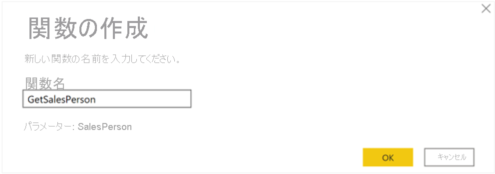 [パラメーター] ウィンドウで、既定のパラメーター名をよりわかりやすい名前に変更し、その目的を明確にします。 この場合は、名前を「SalesPerson」に変更します。
