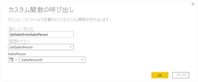 Excel ワークシートから読み込んだ SalesPersonID クエリを選択し、[列の追加] タブで [カスタム関数の呼び出し] を選択して、作成したカスタム関数を実行します。