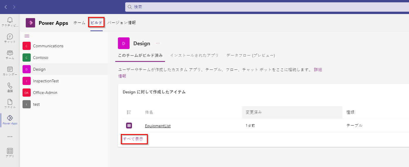 テーブル エディターでテーブルを開くには、ビルド を選択し、すべて表示 を選択します。