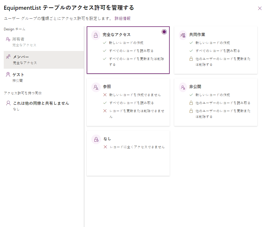 完全なアクセス - ユーザーおよびグループに対して、新規レコードの作成、すべてのレコードの読み取り、およびレコードの更新や削除への完全なアクセスを許可します。 このアクセス レベルは、データを完全に制御する必要があるユーザーにのみ許可する必要があります。