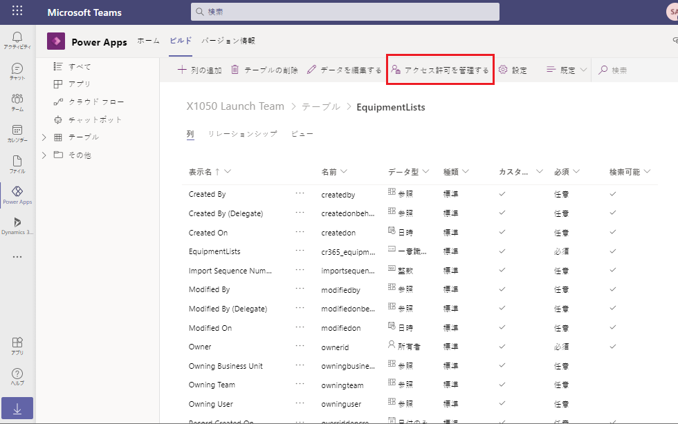 Power Apps の ビルド でテーブルを編集しているときに、リボン メニューから アクセス許可を管理する を選択します。 チームの所有者ではない場合、このオプションは表示されません。