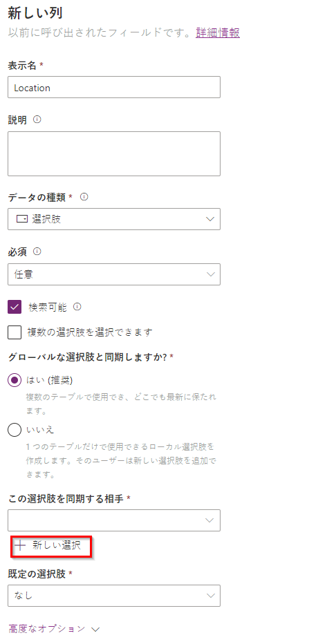 次に、選択肢 の下にある + 新しい選択肢 を選択して、この列の選択肢を定義します。