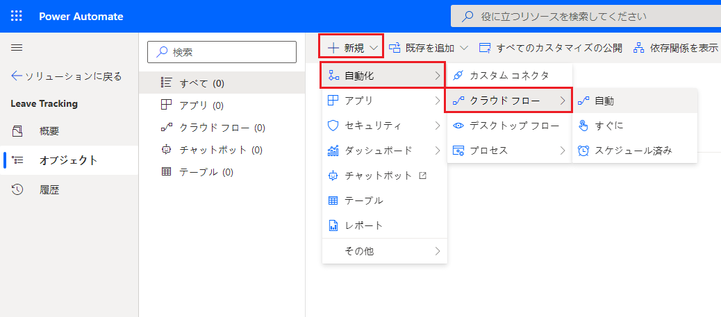 新しいクラウド フローをソリューションで直接作成することも、既存のフローを追加することもできます。 新しいクラウド フローを直接追加するには、選択したソリューションから + 新規を選択します。