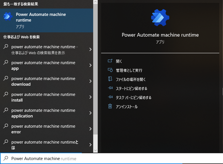 デスクトップの下部にある Windows 検索バーからPower Automate コンピューターランタイムを検索する。
