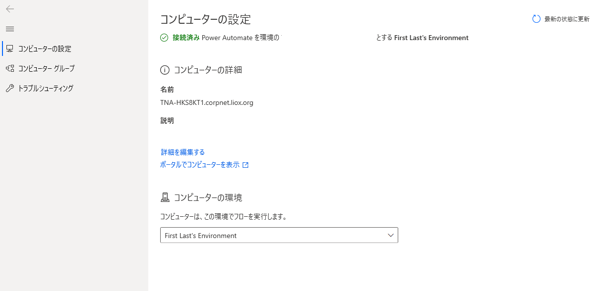 以前に別の環境にコンピューターを登録していない場合は、Power Automate デスクトップがお使いのコンピューターをインストール時に既定の環境に自動的に登録します。そのため、次の手順を手動で実行する必要はありません。 ただし、依然として次の手順を実行することをお勧めします。