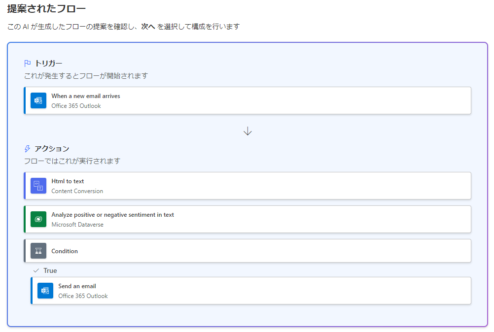 Copilot の応答では、問題を解決できるコネクタをピッキングするなど、上手くいきそうなフローが推奨されます。
