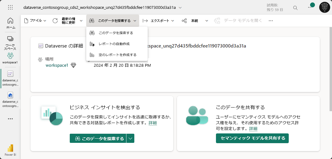 既定のセマンティック モデルで、Power BI を使用してレポートを作成できます。 アクセスするには、ワークスペースで既定のモデルを選択します。 データの探索、レポートの最初からの作成、レポートの自動作成、およびセマンティック モデルから選改ページ対応レポートの作成を行うオプションが提供されます。 データ アナリストは、データを探索した後、ビジュアル インターフェイスを使用して、選択したレポートを作成できます。