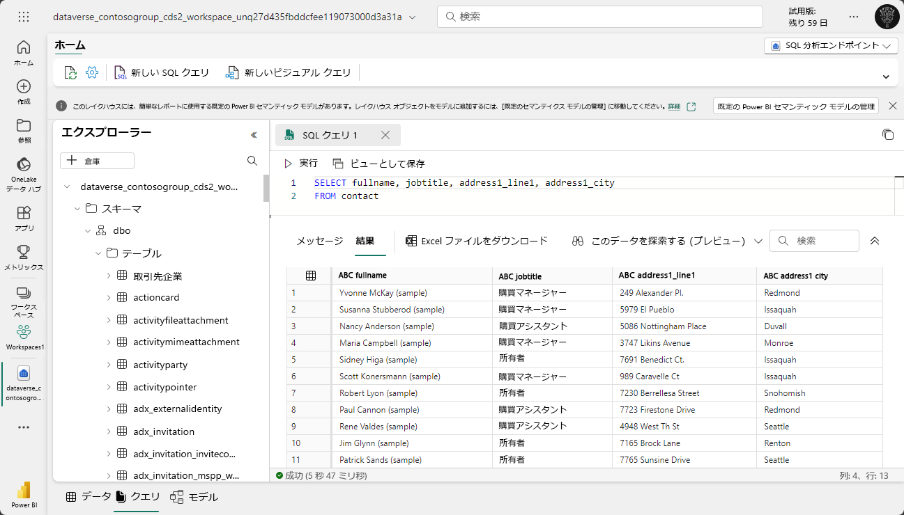 SQL 分析エンドポイントでは、Transact-SQL (T-SQL) を使用してクエリを記述できます。 アクセスするには、ワークスペースで SQL 分析エンドポイントを選択します。 データ アナリストは、Dataverse のデータと、Fabric に格納されている他のソースのデータを組み合わせてレポートのクエリを記述できます。