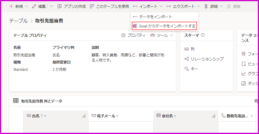 モデル駆動型アプリの [Excel からインポート] 機能では、Exchange の取引先担当者から Contact テーブルにインポートすることもできます。