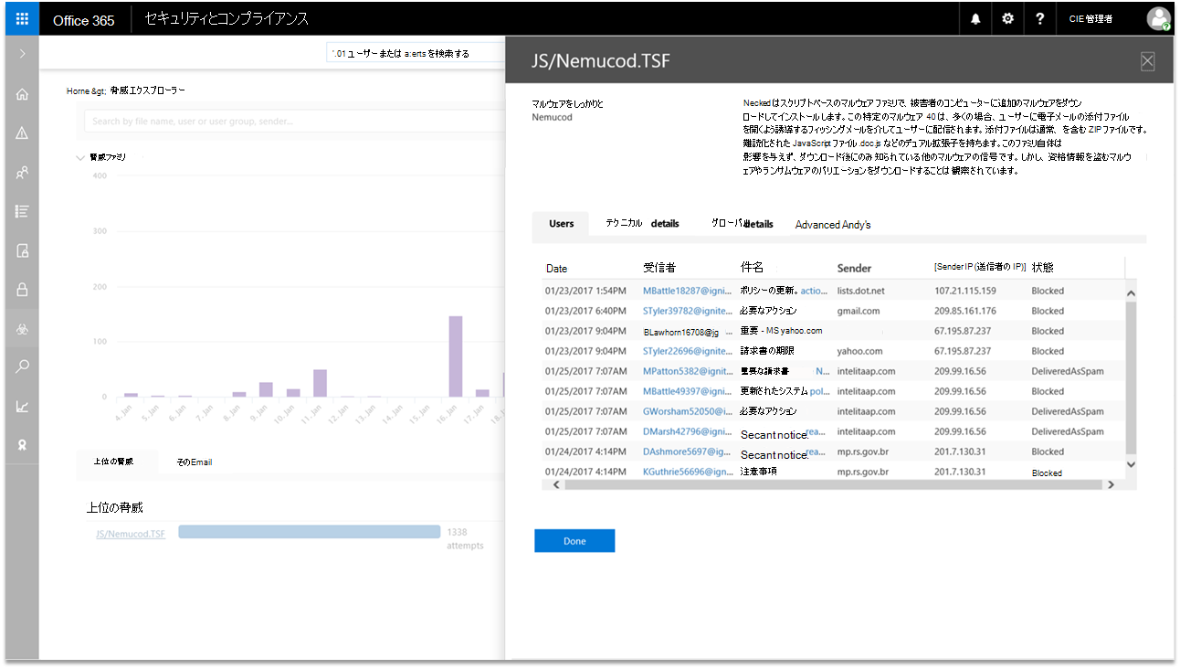 脅威エクスプローラーでは、このマルウェア ファミリの動作を詳しく説明することで、脅威を詳細に調べることができます。 脅威エクスプローラーには、脅威の定義、脅威を送信するメールのメッセージ トレース、脅威の技術的な詳細、脅威のグローバルな詳細、高度な分析を提供します。