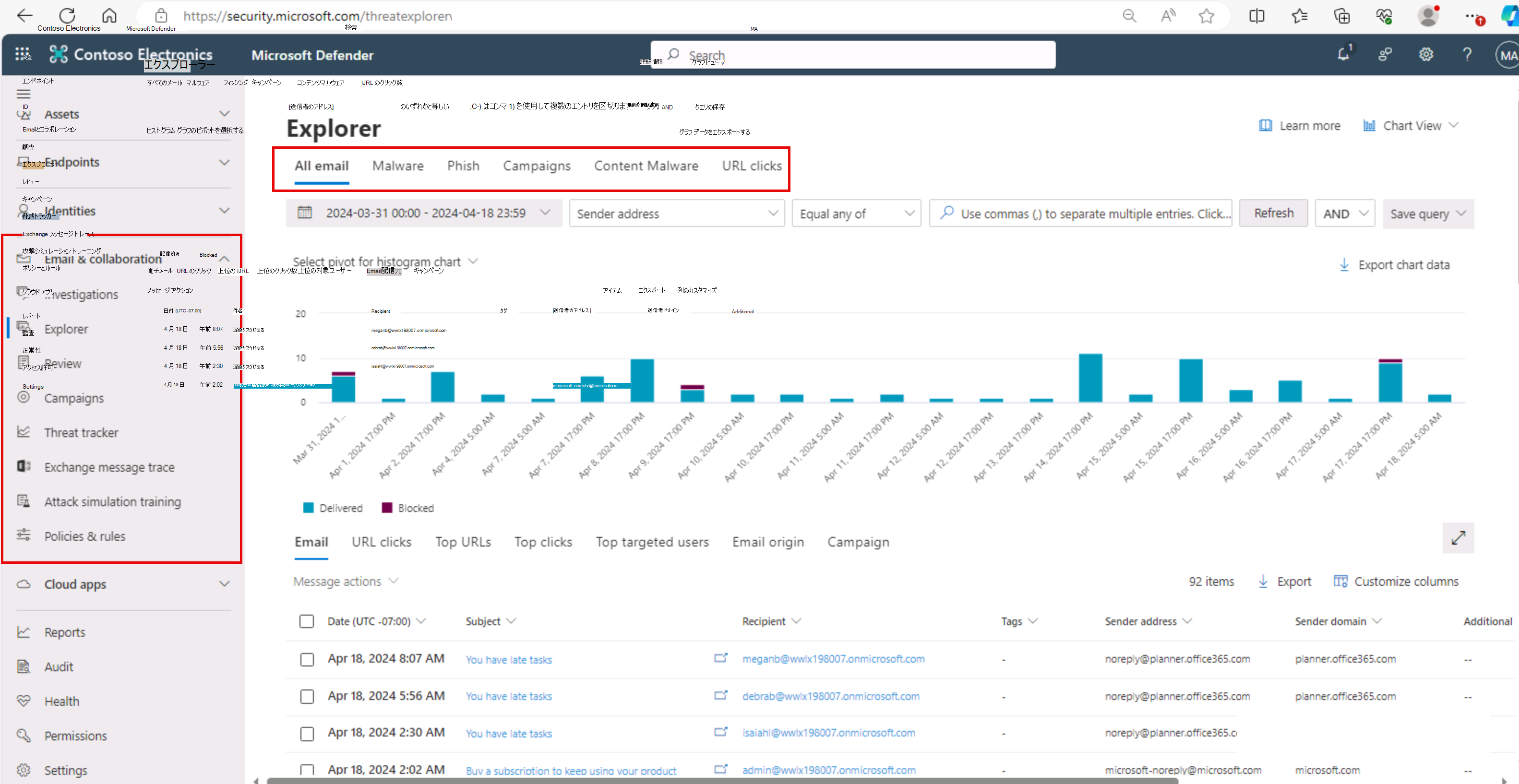 グラフのカテゴリを変更することもできます。 この場合、すべての電子メールが表示され、送信者アドレス、受信者、脅威を停止するために使用される検出テクノロジなど、多くのオプションで [脅威のエクスプローラー] グラフをフィルター処理できます。 検出テクノロジは、クラウドのサンドボックスのMicrosoft DefenderまたはExchange Online Protection (EOP) フィルターを介して電子メールがブロックされているかどうかを識別します。 グラフは、調査中のカテゴリを反映するように調整されます。