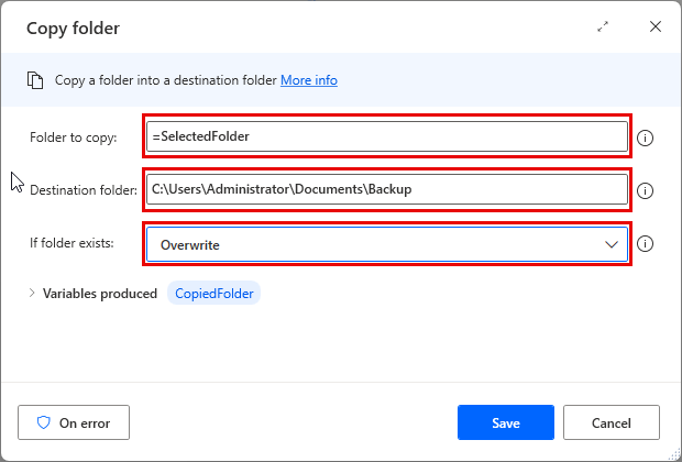 フォルダーをコピー アクションを使用して、選択したフォルダーをドキュメント フォルダーにコピーします。