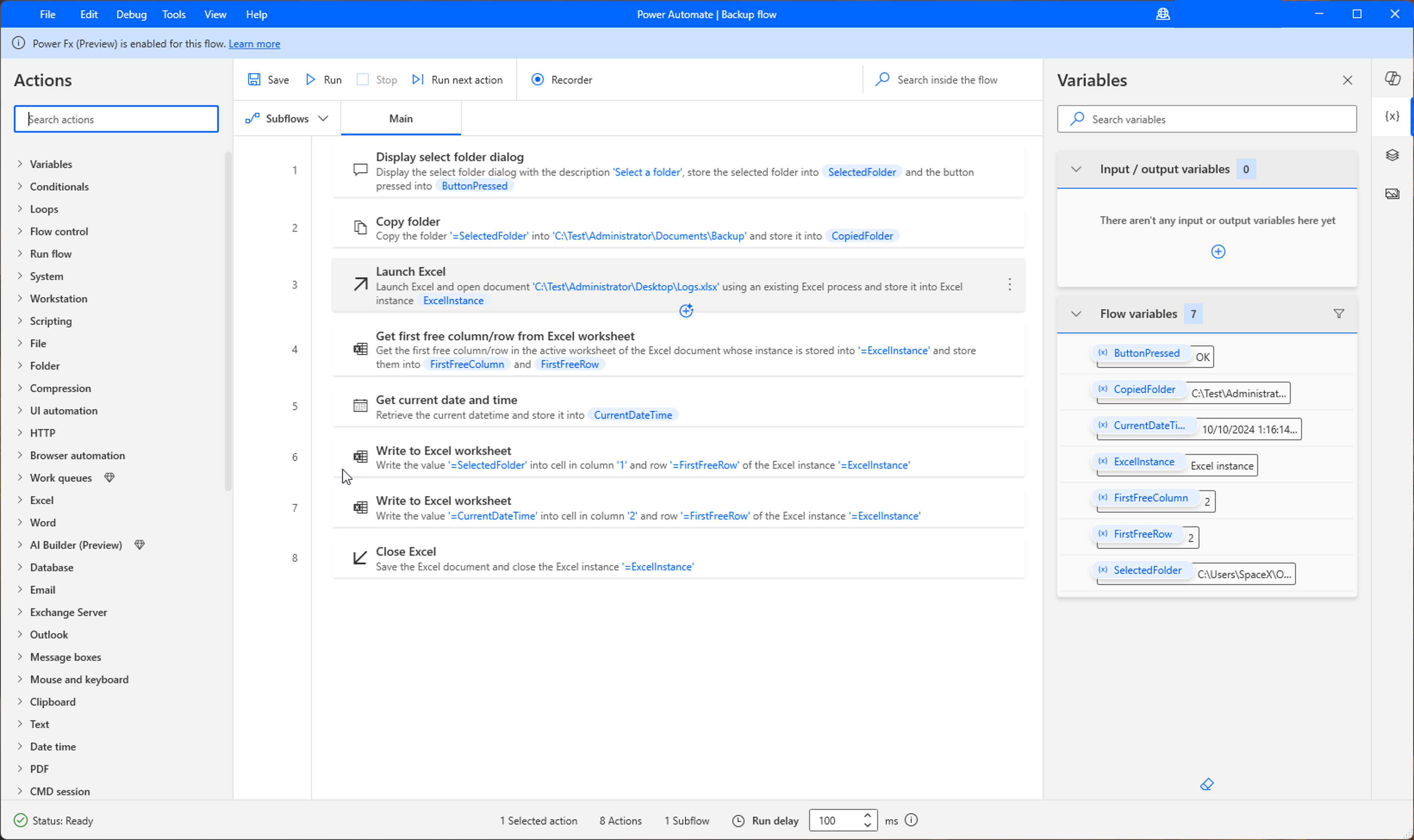 この演習では、選択したフォルダーをコピーして、作成したバックアップに関する情報を Microsoft Excel ファイルに追加するフローを作成します。